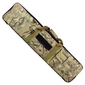 Fodero imbottito per ASG assalto in cordura 106 cm multicam. Con chiusura a doppia zip, 2 fermi interni con velcro, 4 tasche, e una tasca posteriore trasparente. Include manico per trasporto a mano e cinghia regolabile per spalla. Misure esterne: 106x26 cm, interne: 105x24 cm.