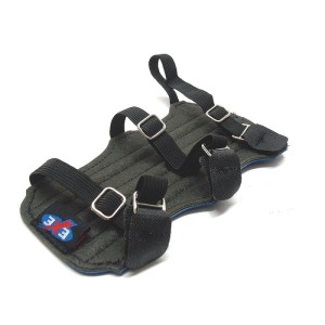 Parabraccio EXE corto per bambini, in vinile azzurro, progettato per il tiro con l'arco. Dotato di sistema di chiusura a strip per una vestibilità sicura. Lunghezza di 18 cm e larghezza massima di 9 cm, offre una protezione comoda e leggera per i giovani tiratori.