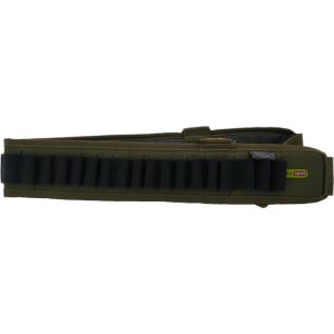 Portacartucce da calcio in robusto nylon, dotato di 5 celle elastiche per cartucce calibro 12/20. Progettato per essere fissato al calcio del fucile tramite sistema a velcro o asole integrate, offre accesso rapido alle munizioni durante la battuta di caccia o il tiro sportivo, garantendo efficienza