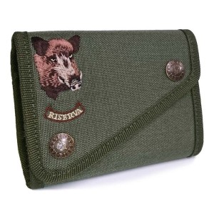 Giberna fodero porta colpi. Porta colpi 11 celle Multicalibro in Cordura Radura HT con ricamo cinghiale. Materiale: Cordura Radura; Colore: Verde; Misure: Multicalibro. Made in Italy.