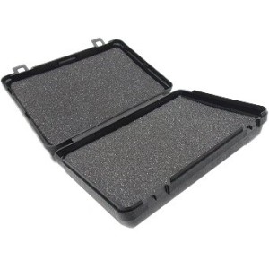 Valigetta in plastica nera porta pistola. Dimensioni: 17x11,5x5 cm. Con spugna liscia interna. Chiusura con due clip in plastica. Prodotto in Italia.