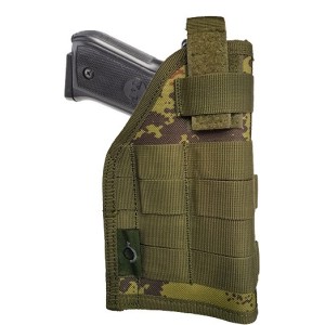 La fondina universale ambidestra Outac Vegetato Italiano è compatibile con Beretta 92 e molti altri modelli di pistola. Realizzata in cordura 900 denari idrorepellente, offre attacchi Molle per un facile montaggio su cinturoni o sistemi Molle. Ideale per uso operativo e sportivo.