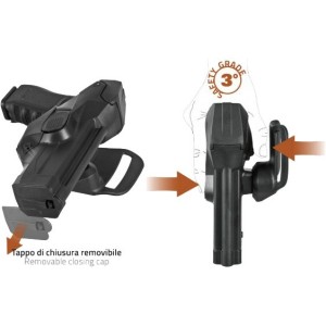 Il sistema di ritenzione può essere sganciato facilmente con un movimento naturale del pollice, consentendo un rapido accesso alla pistola quando necessario. La fondina offre anche una regolazione dell'inclinazione, consentendo di personalizzare l'angolo di porto per adattarsi alle preferenze individuali dell'utilizzatore.