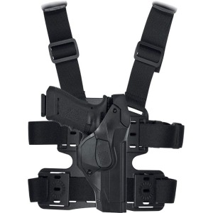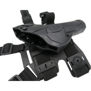 La fondina presenta un design ergonomico che si adatta comodamente alla gamba dell'utilizzatore. Dispone di un sistema di chiusura sicuro che garantisce che la pistola rimanga saldamente al suo posto durante l'attività fisica. Il sistema di ritenzione consente un rapido e fluido estrazione della pistola quando necessario.
