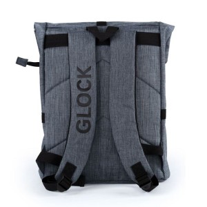 Zaino Glock courier style nel colore grigio caratteristico, 100% poliestere, impermeabile, con logo GLOCK Perfection stampato sul davanti e stampa GLOCK su uno spallaccio.